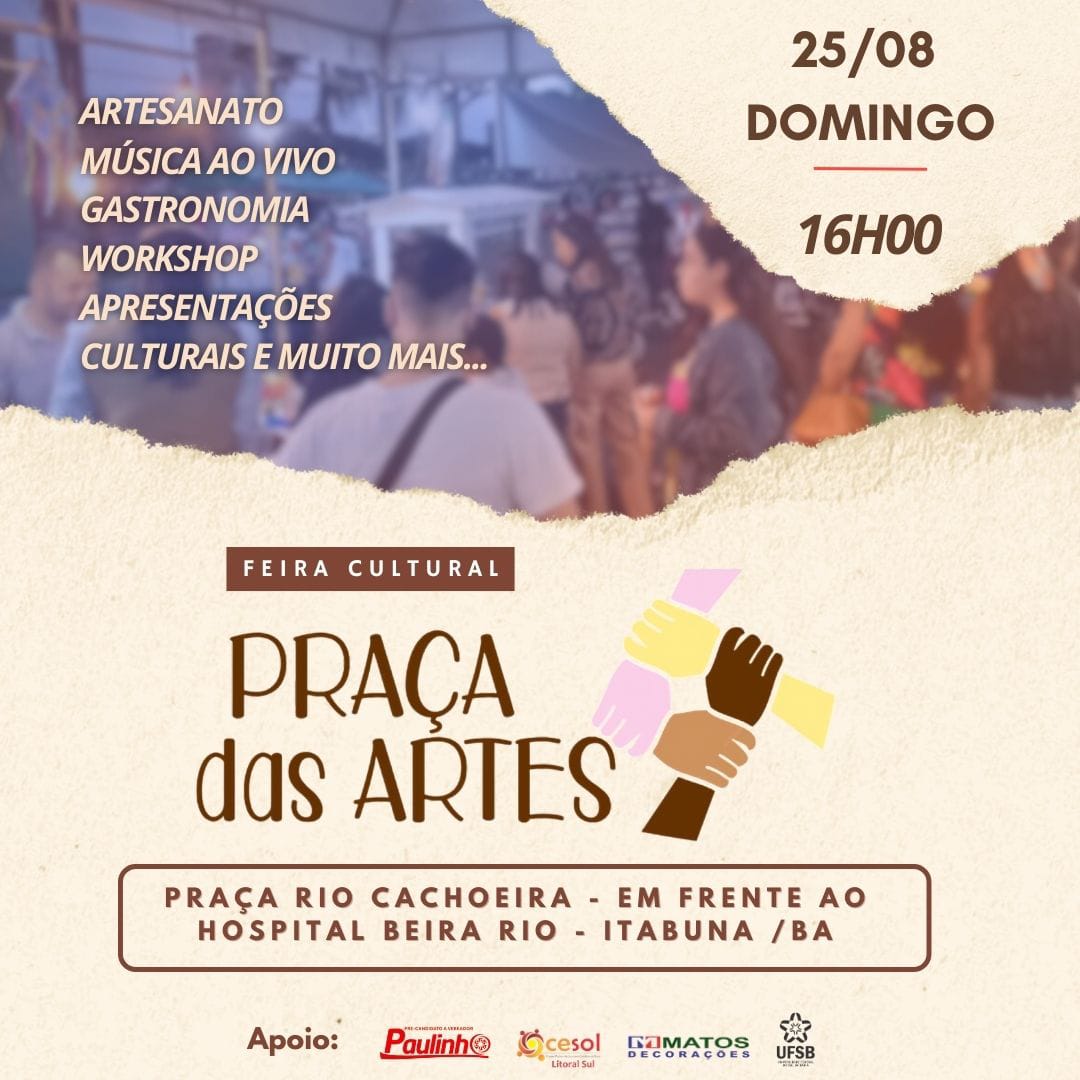 A Praça das Artes acontecerá na Beira-Rio em Itabuna , das 16h às 22h. O evento contará com a participação de 30 expositores. Já se consolidou como opção das famílias , atraindo dezenas de visitantes que buscam o lazer com segurança e de produtos da economia criativa .
