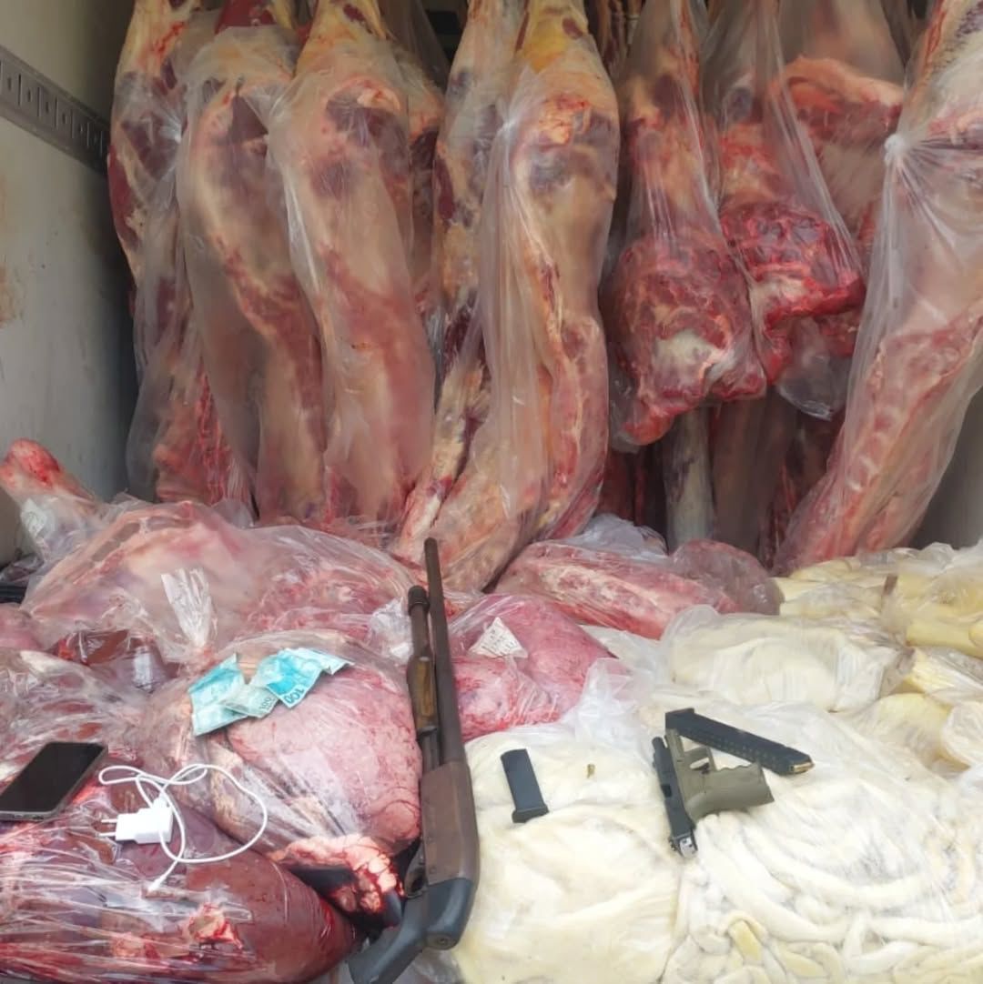 Em rondas pela rodovia Jorge Amado, a guarnição do 3º Pelotão/Salobrinho avistou um veículo com as mesmas características repassadas. Após acompanhamento, foi dada voz de abordagem e constatou-se que se tratava do veículo tomado de assalto e que nele havia cerca de 3.874,70 kg de carne. Em busca pessoal dos elementos, foram encontrados 01 pistola 9MM, 01 espingarda, 45 munições, 04 cartuchos intactos, 01 cartucho deflagrado, dois celulares e R$ 302,00 em espécie.