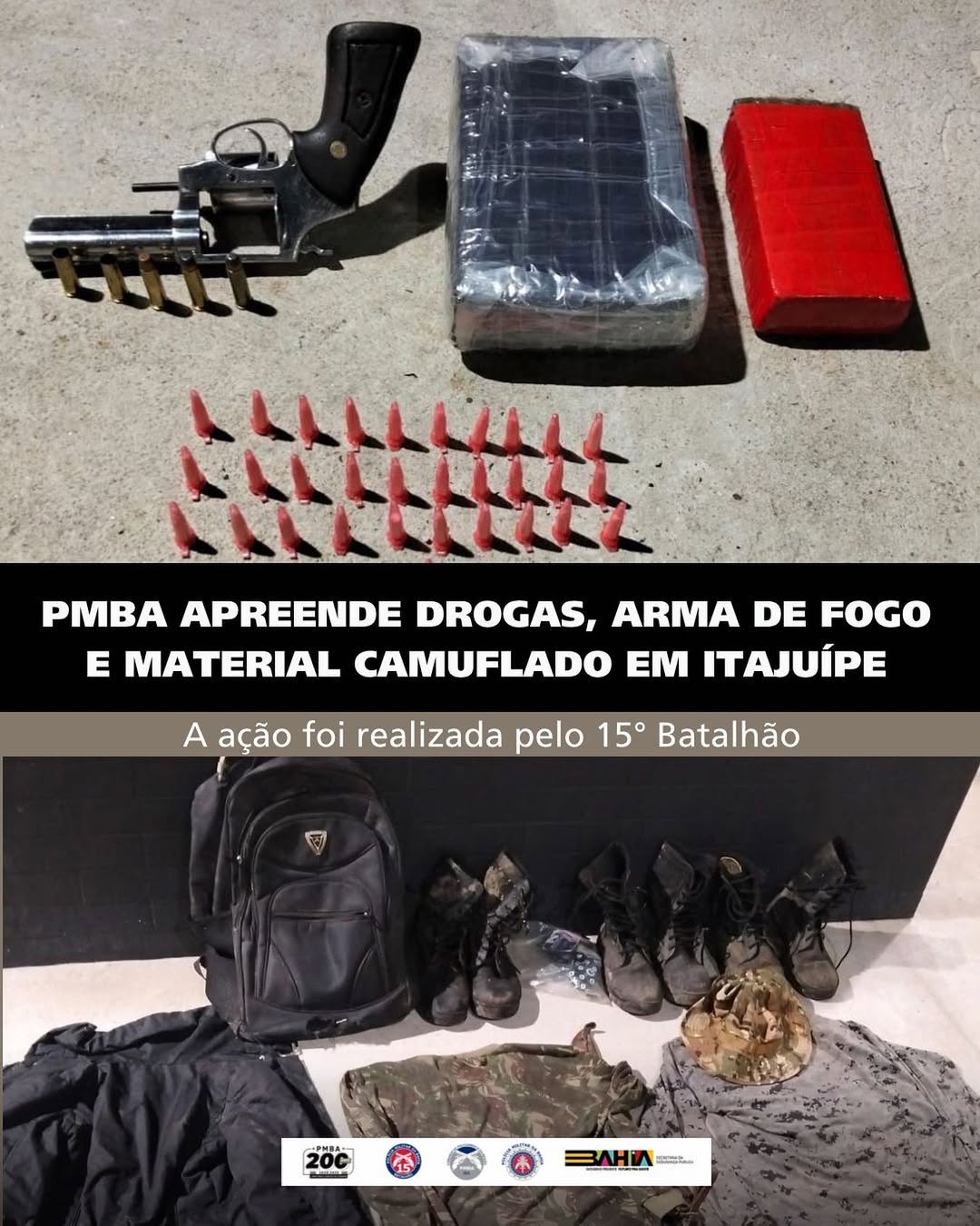 Guarnições do 15º Batalhão da Polícia Militar (BPM) apreenderam na tarde de sexta-feira (6), uma arma de fogo, drogas e material camuflado durante a Operação Garra de Arquimedes, no bairro Santa Edwirges, em Itajuípe.