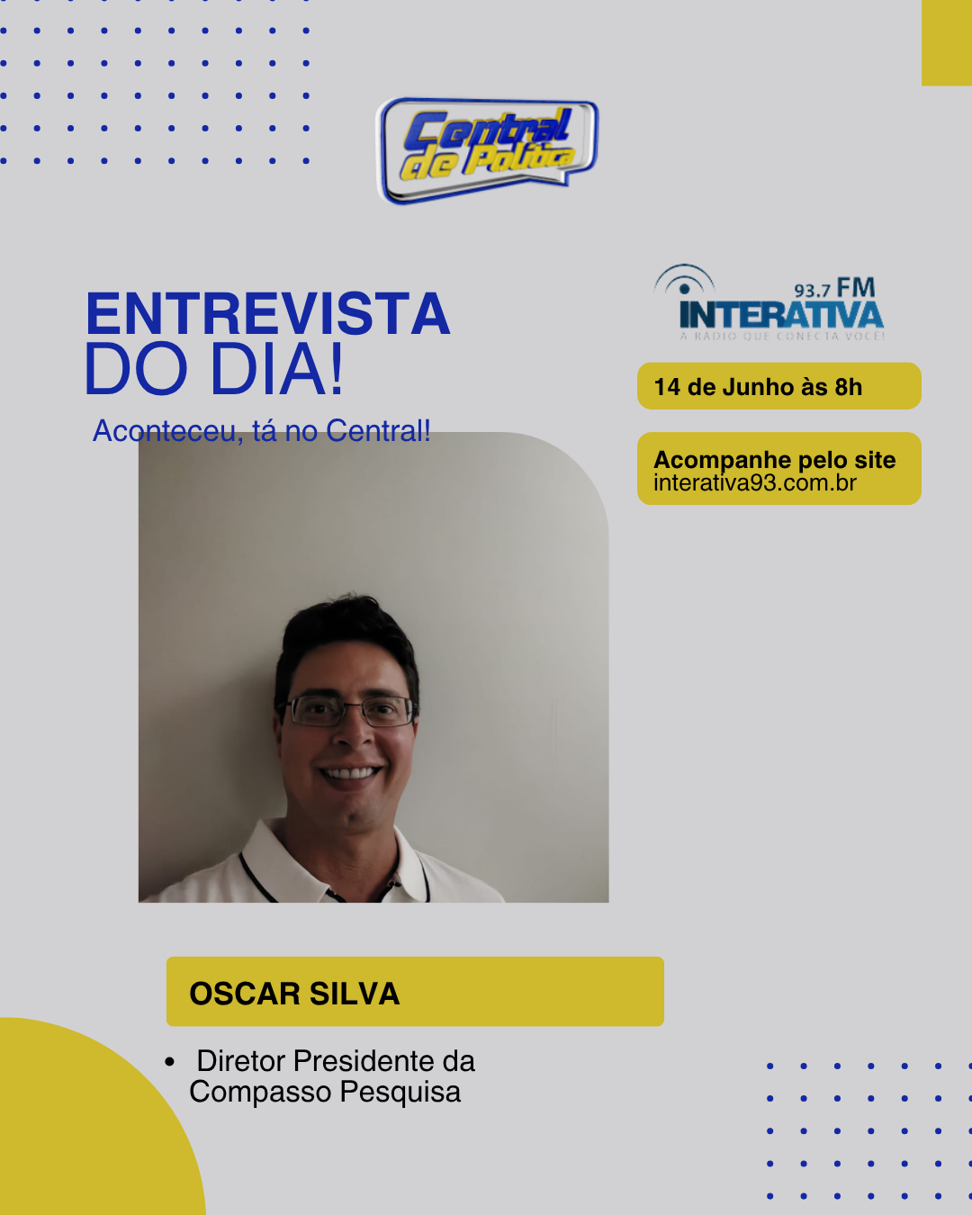 O programa Central de Política, da rádio Interativa FM 93,7, recebe neste sábado, dia 14 de junho, o empresário Oscar Silva, diretor da Compasso Pesquisas, empresa especializada em pesquisas de opinião pública com sede em Itabuna.