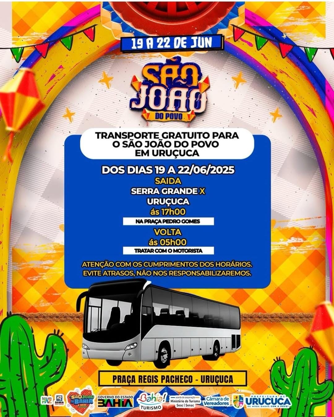 A Prefeitura de Uruçuca anunciou uma ação especial para garantir que ninguém de Serra Grande fique de fora da festa: um esquema de transporte gratuito, no formato bate e volta, para o São João do Povo, que acontece entre os dias 19 e 22 de junho, na Praça Régis Pacheco, sede do município.