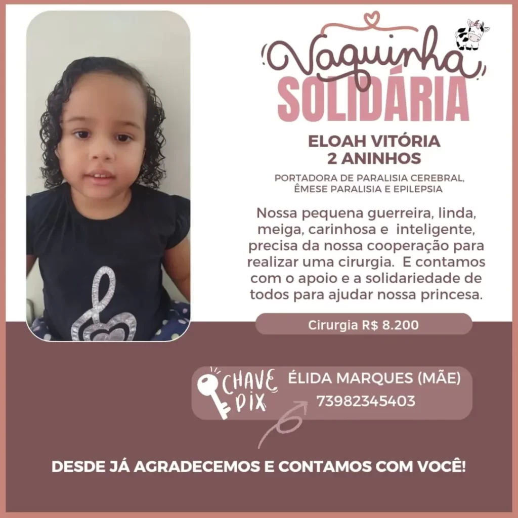 Diante disso, os pais de Eloah estão promovendo uma vaquinha solidária e pedem ajuda da comunidade. Qualquer contribuição pode ser feita via PIX: 7398234-5403, em nome de Élida Marques (mãe da criança).
