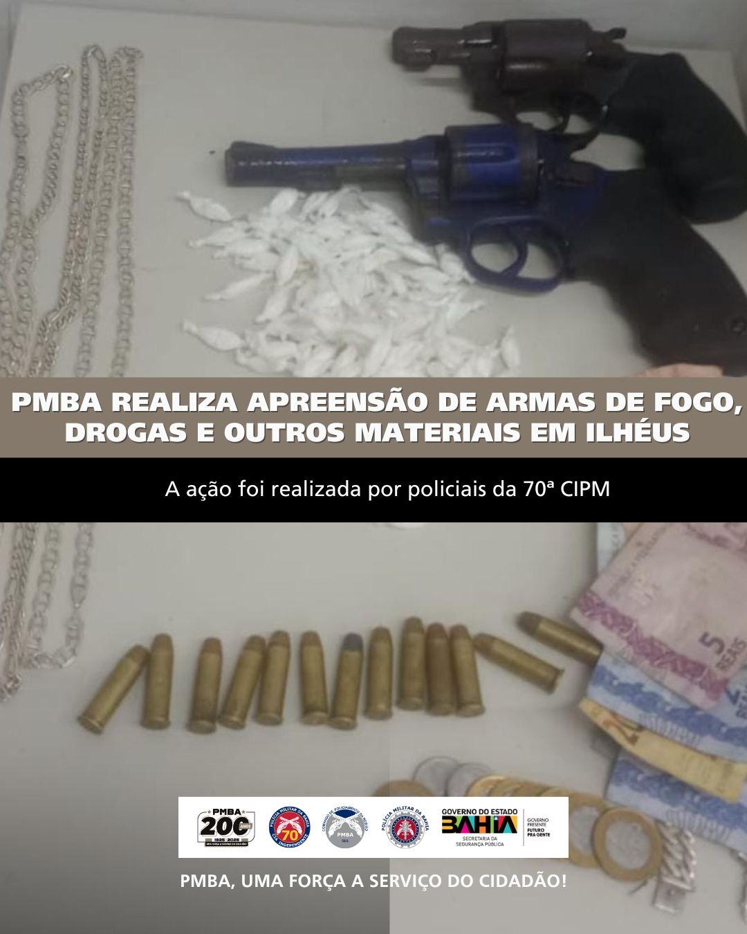 Na noite desta quinta-feira (14), policiais da 70ª Companhia Independente da Polícia Militar (CIPM) apreenderam dois revólveres, munições e uma quantidade de cocaína no bairro Alto do Basílio, em Ilhéus.
