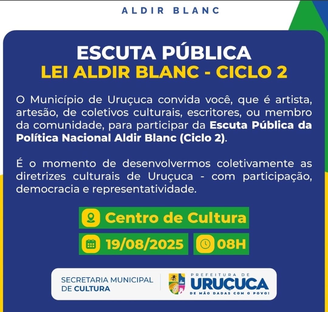 A Prefeitura de Uruçuca, por meio da Secretaria de Cultura, promove no próximo dia 19 de agosto, às 8h, no Centro de Cultura, uma escuta pública voltada para artistas, fazedores de cultura e a comunidade em geral.