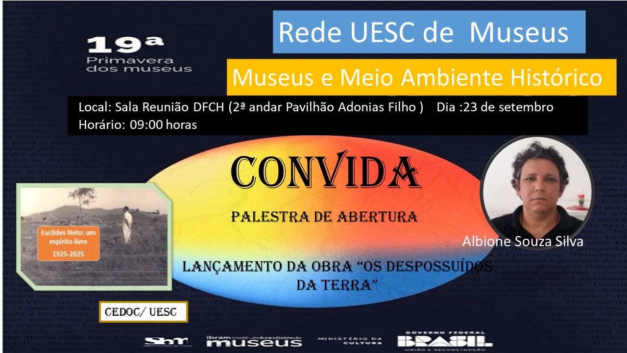 No CEDOC-UESC, a programação tem início às 9h, com visita à exposição permanente “Euclides Neto, um espírito livre (1925-2025)”, seguida de palestra e do lançamento do livro “Os Depossuídos da Terra”, do escritor Albione Souza Silva. As atividades acontecem no Pavilhão Adonias Filho.