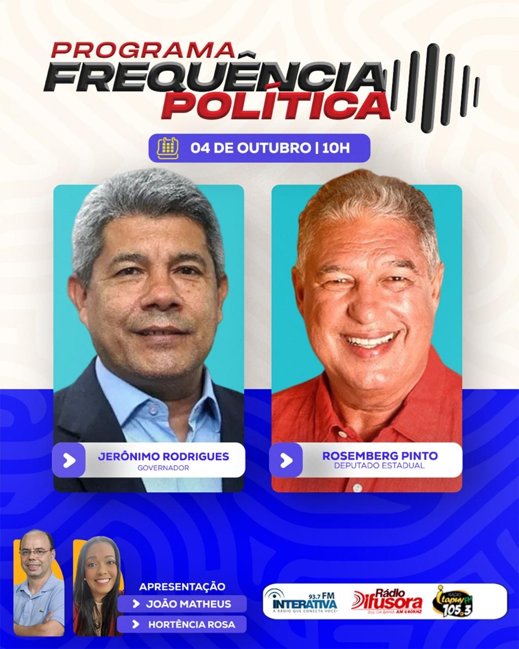 O programa Frequência Política deste sábado promete uma edição especial. A atração vai receber o deputado estadual Rosemberg Pinto e exibir uma entrevista exclusiva com o governador da Bahia, Jerônimo Rodrigues (PT).