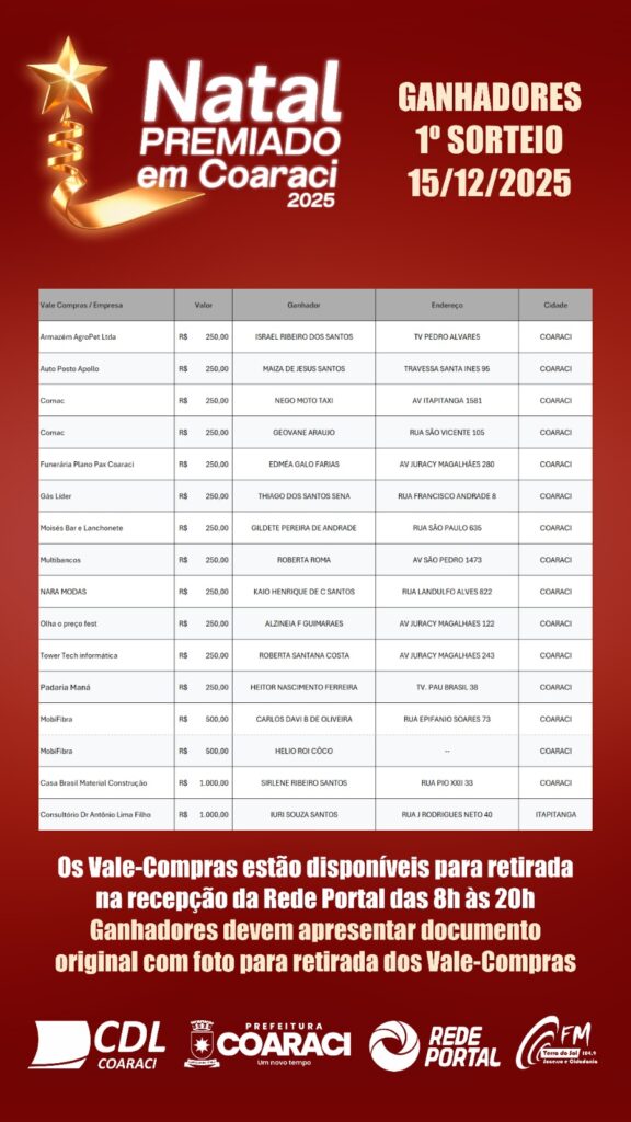 Ocorreu no início da tarde desta segunda 15 de dezembro o primeiro sorteio da Campanha Natal Premiado 2025 no município de Coaraci. Foram contemplados 16 ganhadores com Vale Compras de R$ 250,00, R$ 500,00 e R$ 1.000,00. Ao todo foram sorteados R$ 6.000,00 (Seis Mil Reais) em vale compras nessa primeira etapa. Os próximos sorteios acontecem nos dias 22 e 29 de dezembro e 05 de Janeiro, onde mais 97 ganhadores serão contemplados.